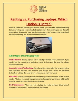 Here we explain the benefits of renting versus purchasing laptops. Renting laptops offers flexibility, cost-effectiveness, and access to the latest models for short-term needs. Laptop Rental in Dubai from Techno Edge Systems LLC ensures quick delivery and affordable pricing. Contact us at +971-54-4653108. Visit us - https://www.laptoprentaluae.com/laptops-rental-dubai/