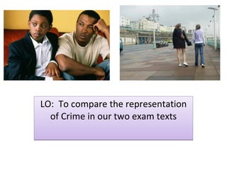 The document discusses comparing the representation of crime in two exam texts. Students are asked to discuss in pairs or groups how crime was represented in each film by filling out a comparison sheet. They are also asked to consider whether the films are more similar or different in their depiction of crime.