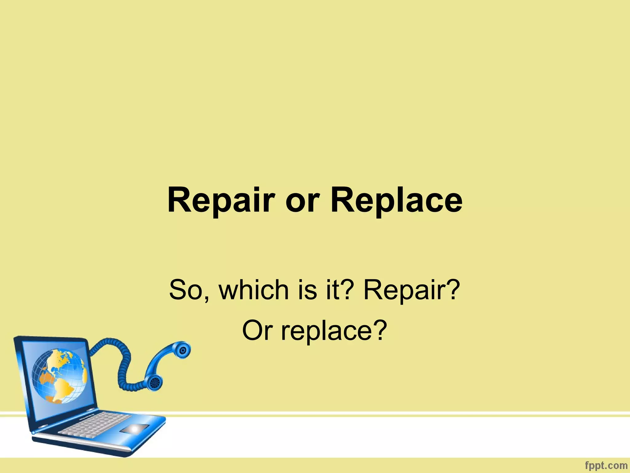 The document discusses factors to consider when determining whether to repair or replace a laptop. It suggests first identifying if the problem is software or hardware related. If hardware, then consider the cost of repairs versus a new laptop. A new laptop may be worth it if repairs are over 1/3 the cost of new, or if it offers two improvements. Laptop age, extent of damage, and warranty coverage should also influence the decision. The document provides guidelines but notes the decision depends on individual circumstances.
