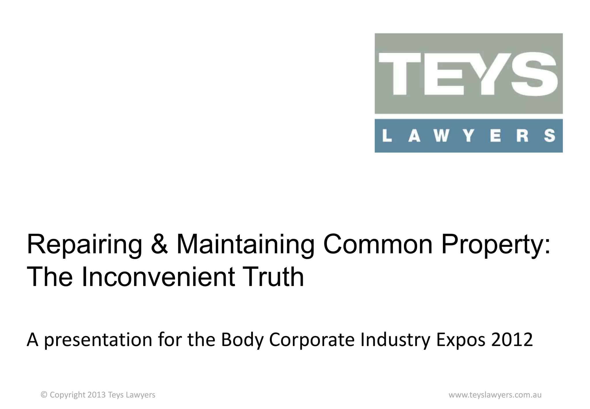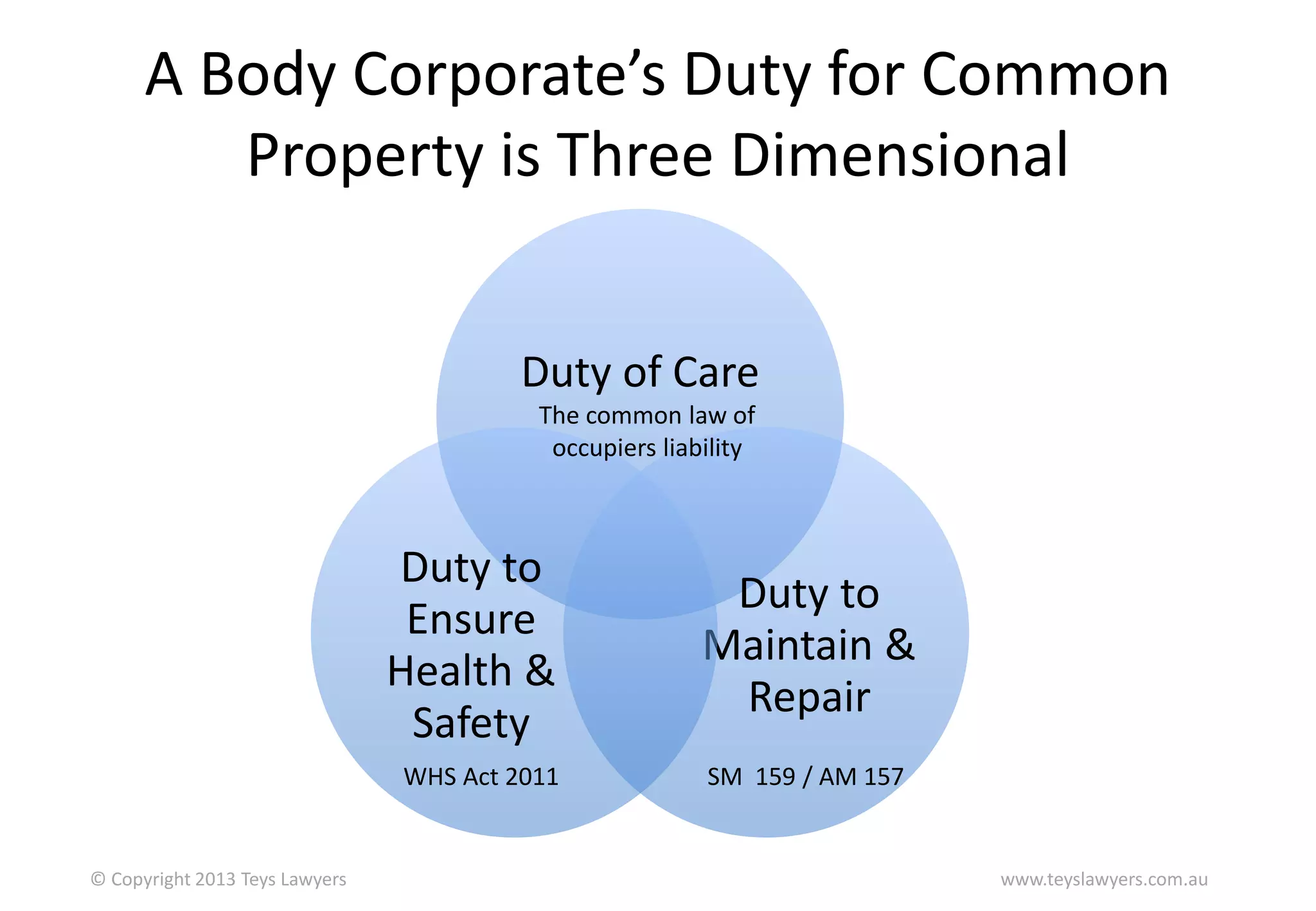 The document outlines the responsibilities of body corporates in maintaining common property under Australian laws, emphasizing the duty of care to ensure health and safety in compliance with current standards. It discusses legal precedents and increasing penalties under new workplace health and safety regulations, highlighting the necessity for proactive management and due diligence. Additionally, it offers resources for developing a systematic approach to compliance and identifies key roles within the strata framework.