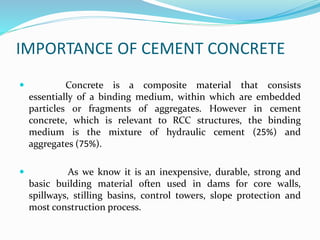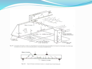 The document discusses the repair of damaged concrete structures. It begins by explaining the importance of cement concrete and factors that can cause damage like poor workmanship, construction procedures, and materials. Common types of damage include cracking, spalling, scaling, and corrosion. A proper evaluation involves visual inspection, detailed crack mapping, non-destructive testing, and instrumentation. Common repair methods include patching, overlays, jacketing, shotcrete, and strengthening techniques like FRP. For a successful repair, it is important to select compatible materials, properly prepare the surface, and ensure continuity with the existing structure.