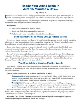 1) The document provides tips and exercises that can be done in 15 minutes a day to repair an aging brain and prevent cognitive decline, including crossword puzzles, social games, strength training, and meditation.
