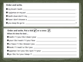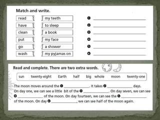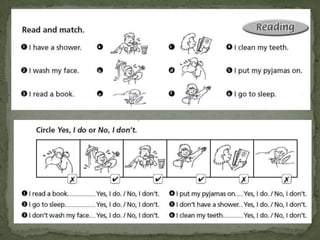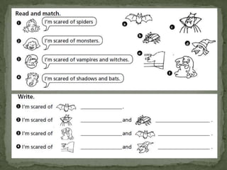 The document provides 10 sentences in English and their Spanish translations. The sentences discuss various nighttime routines like being afraid of witches and shadows, reading books before bed, showering and brushing teeth at night. They also mention favorite books involving witches and ghosts, as well as friends wanting to scare others. The document teaches basic Spanish translations of common phrases involving bedtime routines and activities.