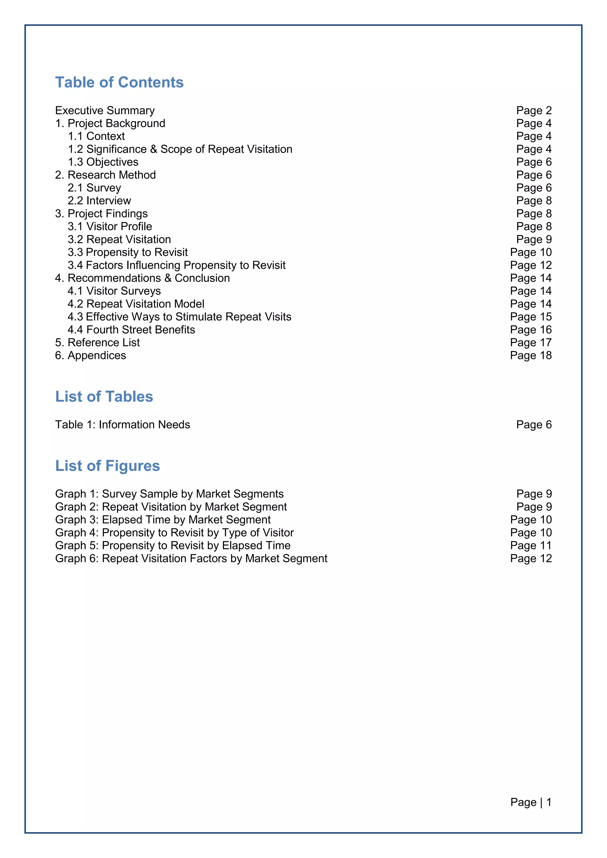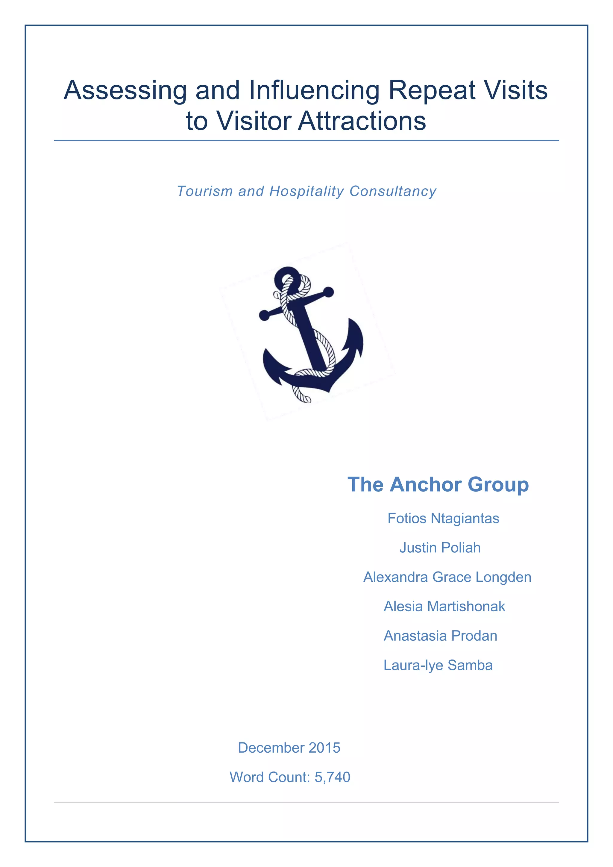 This document summarizes a research project assessing factors that influence repeat visits to visitor attractions. It conducted a survey of 111 visitors to the Old Royal Naval College in London, identifying three main visitor segments: local residents, UK tourists, and international tourists. Key findings include that 45% of visitors had visited before, with most repeat visits from residents within the last 6-24 months. 32% expressed strong intent to revisit within a year. Proximity, free entry, and spending time with others were most influential in propensity to revisit. The report recommends adapting surveys to better capture repeat visit data, developing a repeat visitation forecasting model, and stimulating repeats through technology, retail, events, and marketing.