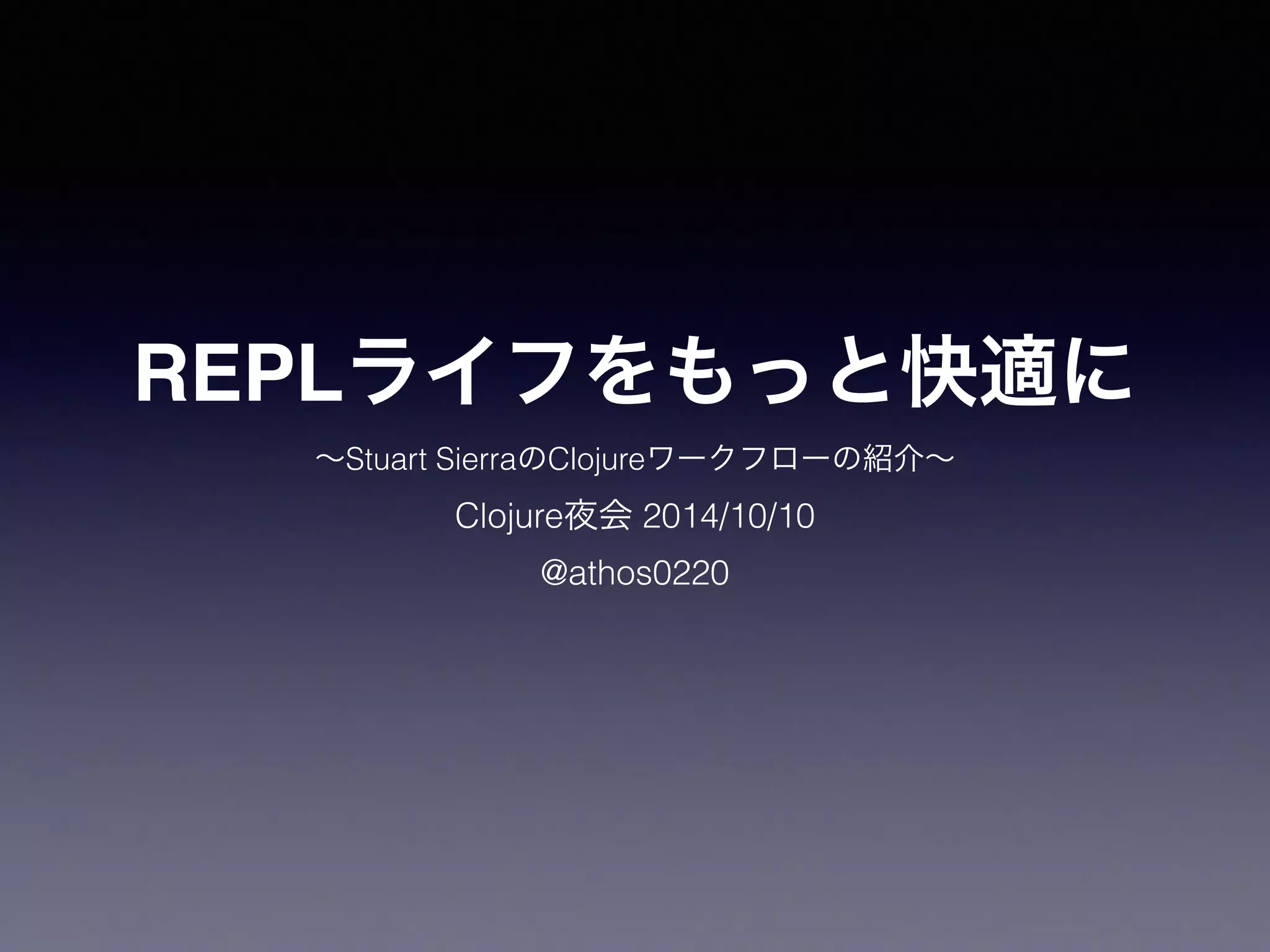 REPLライフをもっと快適に! ∼Stuart SierraのClojureワークフローの紹介∼ Clojure夜会 2014/10/10 @athos0220