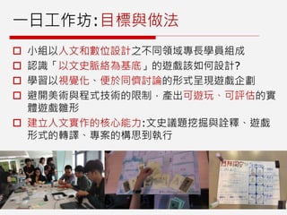 本文件描述了一个以历史为主题的游戏叙事工作坊,旨在培养学生在人文和数字设计领域的核心能力。学员通过小组合作,学习如何设计以文史脉络为基础的游戏,并制作可玩的游戏雏形。活动包含了关于游戏设计流程的讨论、案例分析和实作练习,以促进对历史主题的深入理解和创意表达。