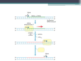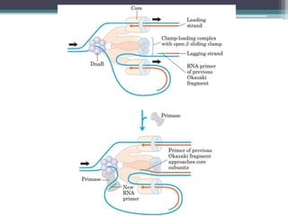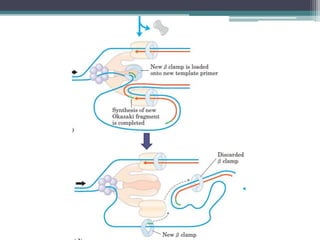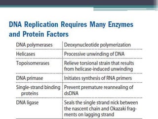 - Replication in eukaryotes involves multiple origins of replication, several DNA polymerases, and other proteins like PCNA and RFC. It also must coordinate with packaging DNA into chromatin and replication of mitochondrial DNA.