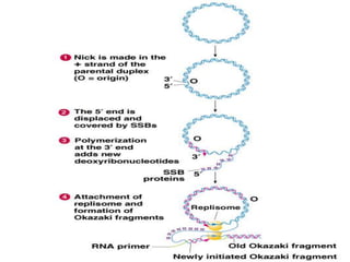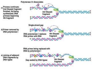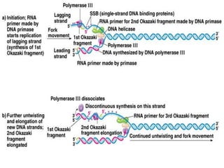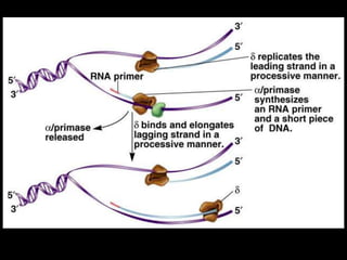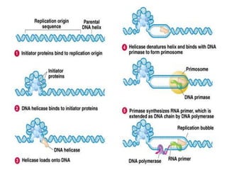 DNA replication is a complex process that involves unwinding of the DNA double helix, synthesis of new strands that are complementary to the original strands, and enzymes such as DNA polymerase and helicase. There are multiple origins of replication in eukaryotes that allow bidirectional replication from many starting points along DNA molecules. Enzymes involved include DNA polymerase alpha that works with primase to initiate DNA synthesis, and DNA polymerases delta and epsilon that carry out leading and lagging strand elongation. Telomeres prevent shortening of chromosomes with each round of replication through the action of telomerase.