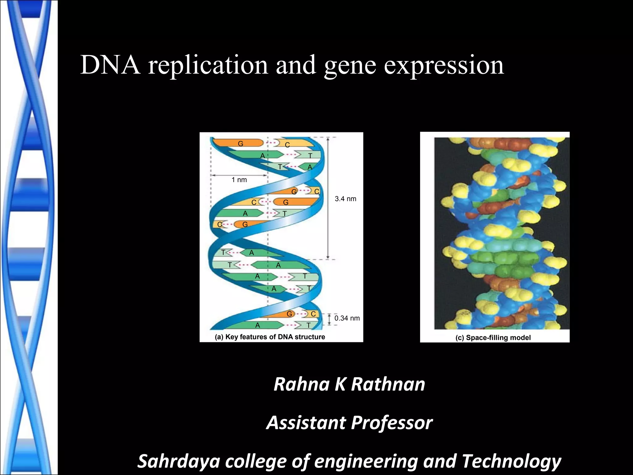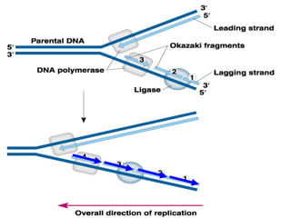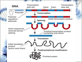 DNA replication and gene expression are the two main processes by which DNA is copied and expressed. DNA replication involves unwinding the parental DNA strands, synthesizing new complementary strands according to base pairing rules, resulting in two identical copies of the original DNA. Gene expression involves transcription of DNA into RNA and translation of RNA into protein. Transcription occurs in the nucleus and involves RNA polymerase making an RNA copy of a gene. The RNA then undergoes processing before being exported to the cytoplasm for translation by ribosomes into a polypeptide chain according to the genetic code.