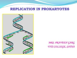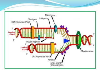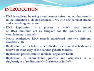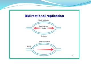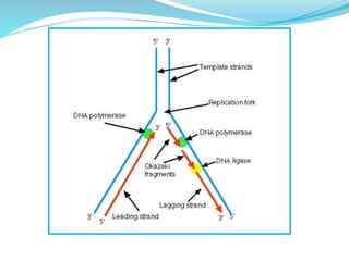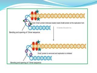 The document summarizes the process of DNA replication in prokaryotes. It describes that replication initiates at the origin of replication (oriC) site and proceeds bidirectionally. There are three main steps - initiation, elongation, and termination. In initiation, proteins help unwind DNA at oriC. In elongation, primase synthesizes primers and DNA polymerase adds nucleotides to replicate both leading and lagging strands. In termination, RNA primers are removed and DNA ligase seals the replicated DNA, completing replication.