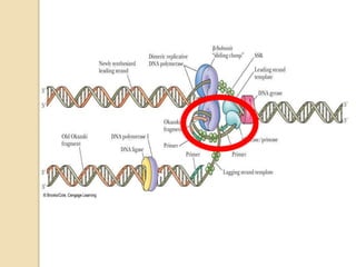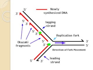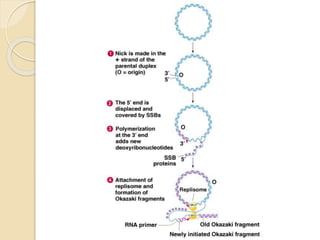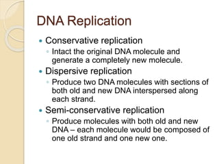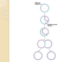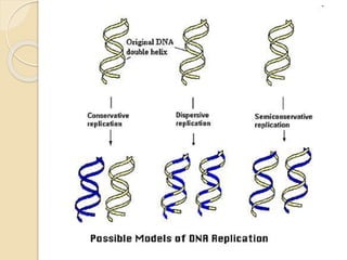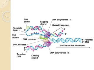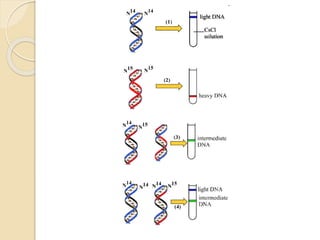 The document summarizes key aspects of DNA replication in bacteria. It describes the semi-conservative model of replication, which was experimentally proven by Meselson and Stahl using E. coli. Replication initiates at a fixed origin and proceeds bidirectionally. It involves unwinding of DNA by helicase, synthesis of new strands by DNA polymerase, and ligation of Okazaki fragments. Replication is tightly regulated to occur once per cell cycle.