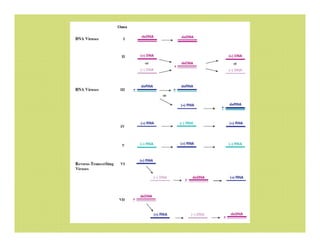 This document discusses the replication of viruses. It describes the key steps in the viral replication process, including attachment to host cells, entry/penetration, uncoating, transcription, translation, replication of the viral genome, assembly, and release. It provides details on the mechanisms and enzymes involved at each step. The replication process allows viruses to multiply inside host cells by using the host's cellular machinery to produce progeny virions.