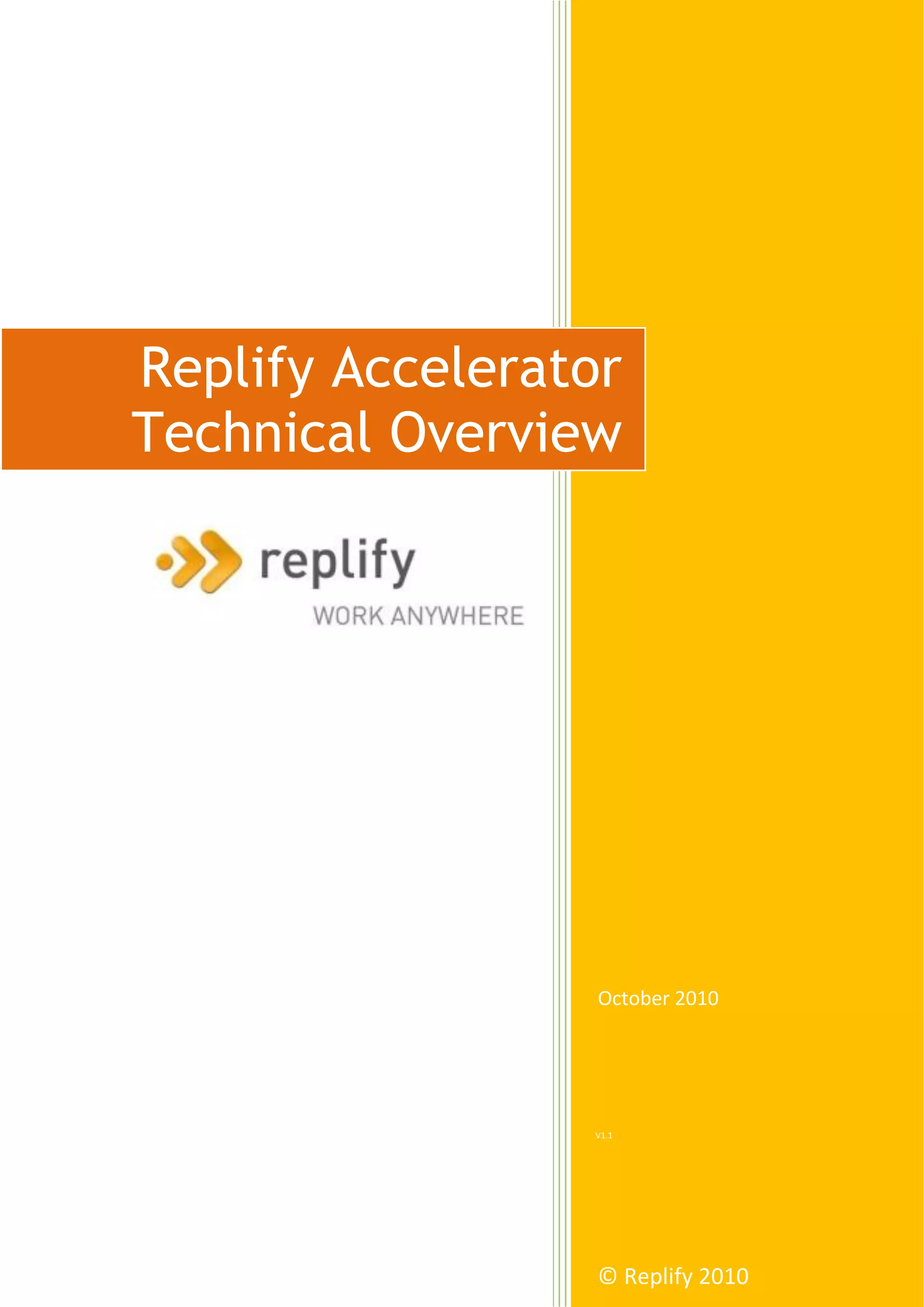 Replify Accelerator is a software-based WAN optimization solution that provides protocol optimization, de-duplication, and compression to remove redundant data and improve application performance over wide area networks. It can be deployed as individual clients, virtual appliances in branch offices and data centers, or in hybrid scenarios. Replify Accelerator analyzes application traffic patterns and caches frequently used data to optimize protocols like CIFS, HTTP, and others. This significantly reduces the number of requests and amount of data transferred over latency-heavy WAN links. Reporting tools provide insights into optimization effectiveness and traffic patterns.