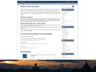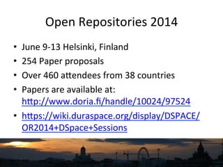 This document summarizes Claire Knowles' presentation on updates from the Open Repositories 2014 conference regarding DSpace. The conference had over 460 attendees from 38 countries discussing repository topics. DSpace version 4 was recently released with new features, and version 5 is planned for late 2014 focusing on ORCID support, metadata for all objects, and streaming audio/visuals. Jisc is working on a repository shared services project to integrate key repository services and support open access.