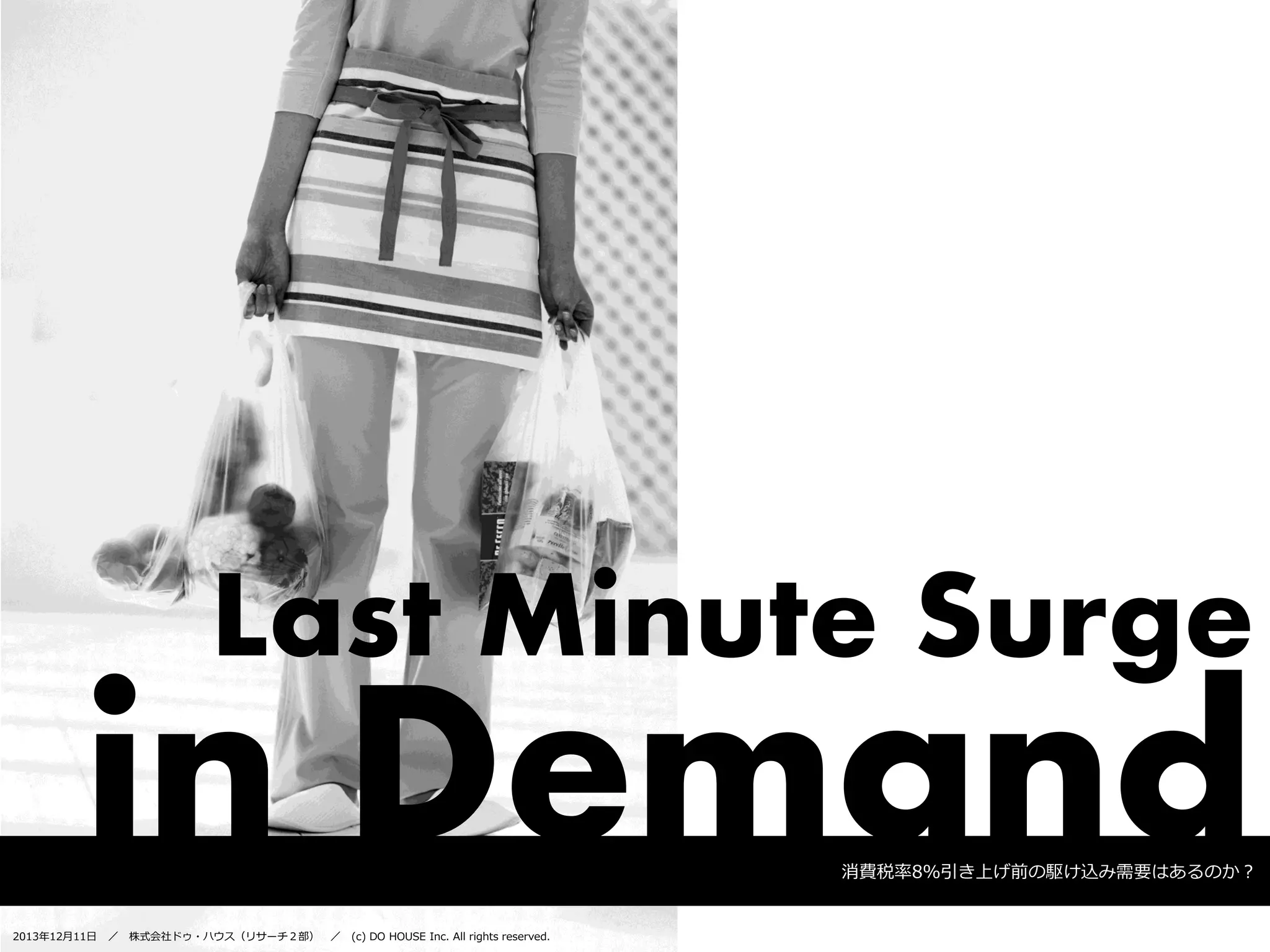 in Demand 消費税率8%引き上げ前の駆け込み需要はあるのか? レトルト食品 基礎調味料 炭酸飲料 果実飲料 健康・ダイエット関連商品 健康・ダイエット関連商品 (サプリメント) (ドリンク) ガーデニング用品 家電 食材(たまご、乳製品)の 駆け込み需要予測 メニュー専用調味料 (砂糖、塩など) インスタント食品 (Cook DOなど) コーヒー ミネラルウォーター 化粧品 掃除用品 パソコン関連用品(USBメ 文具 モリ、メモリカードなど) ドレッシング 野菜飲料 洗面・バス用品(洗顔料、 シャンプー、リンスなど) DVD/CD お菓子 冷凍菓子(アイスなど) 食材(米、野菜、果物) 健康飲料(青汁、健康 スポーツドリンク アルコール飲料 ベビー用品 子ども用のおもちゃ ペットフード 書籍/雑誌 キッチン用品 食材(肉、魚) 食材(たまご、乳製品) 食材(製菓材料) 栄養ドリンク 乳性飲料 お茶 服飾品 ジュースなど) ペットフード以外のペット 用品(首輪、リードなど) 家具 インテリア用品(カーテン、 カーペットなど) ◎まとめ買いをする割合は1.3%。駆け込み需要対策の効果は限定的であると考えられるが、競合対策は重要である。 まとめ買いをする時期 属性別普段の購入率 属性別まとめ買いをする割合 普段と同じチャネルで / 株式会社ドゥ・ハウス(リサーチ2部) / (c) DO HOUSE Inc. All rights reserved. 普段と同じブランドを まとめ買いをする割合 2013年12月11日 まとめ買いをするブランドを 決めている割合 まとめ買いをする割合 24