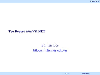 Tài liệu hướng dẫn về việc tạo và sử dụng báo cáo trong Visual Studio .NET, bao gồm việc so sánh giữa Crystal Report và RDLC. Nó cũng giải quyết các vấn đề phổ biến như lỗi khi biên dịch báo cáo và cách thay đổi chuỗi kết nối khi chạy ứng dụng trên máy khác. Cuối cùng, tài liệu đưa ra các hướng dẫn áp dụng LINQ vào Crystal Report và cách cấu hình cho ứng dụng.