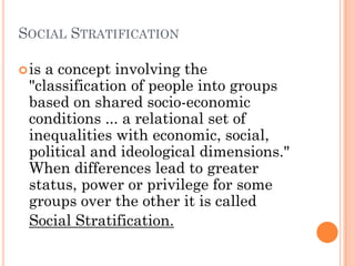 Social stratification involves classifying people into hierarchical social groups based on factors like wealth, power, and status. Social mobility refers to movement between these social strata, either vertically between classes or horizontally within the same class. In the Philippines, social stratification is evident and influences many aspects of society, with wealth, education levels, government connections, and physical appearance impacting people's social standing and opportunities. While social stratification exists, social mobility allows for improvement in life and is important for a harmonious society.