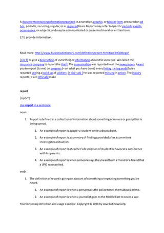 A report is a formal document that provides information or makes recommendations on a topic or event. It can be used to present facts, analyze situations, or provide practical information from tests or experiments. Effective reports are accurate, objective, and follow a clear format. They include key elements like an introduction, body, and conclusion. Careful planning and drafting are important steps to produce high-quality reports that meet readers' needs.