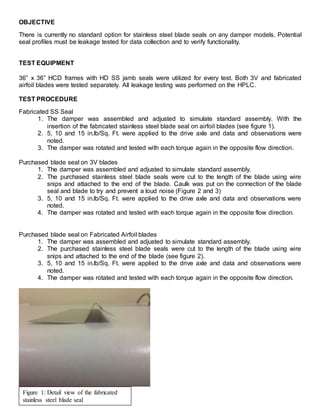 1) Three types of stainless steel blade seals were tested on dampers - a fabricated seal and two purchased seals. 2) Testing involved measuring air leakage of dampers at varying static pressures and torque levels in both flow directions. 3) The fabricated seal performed well but was not feasible for production. The purchased seals performed better than standard seals and were easy to install, though some noise occurred.