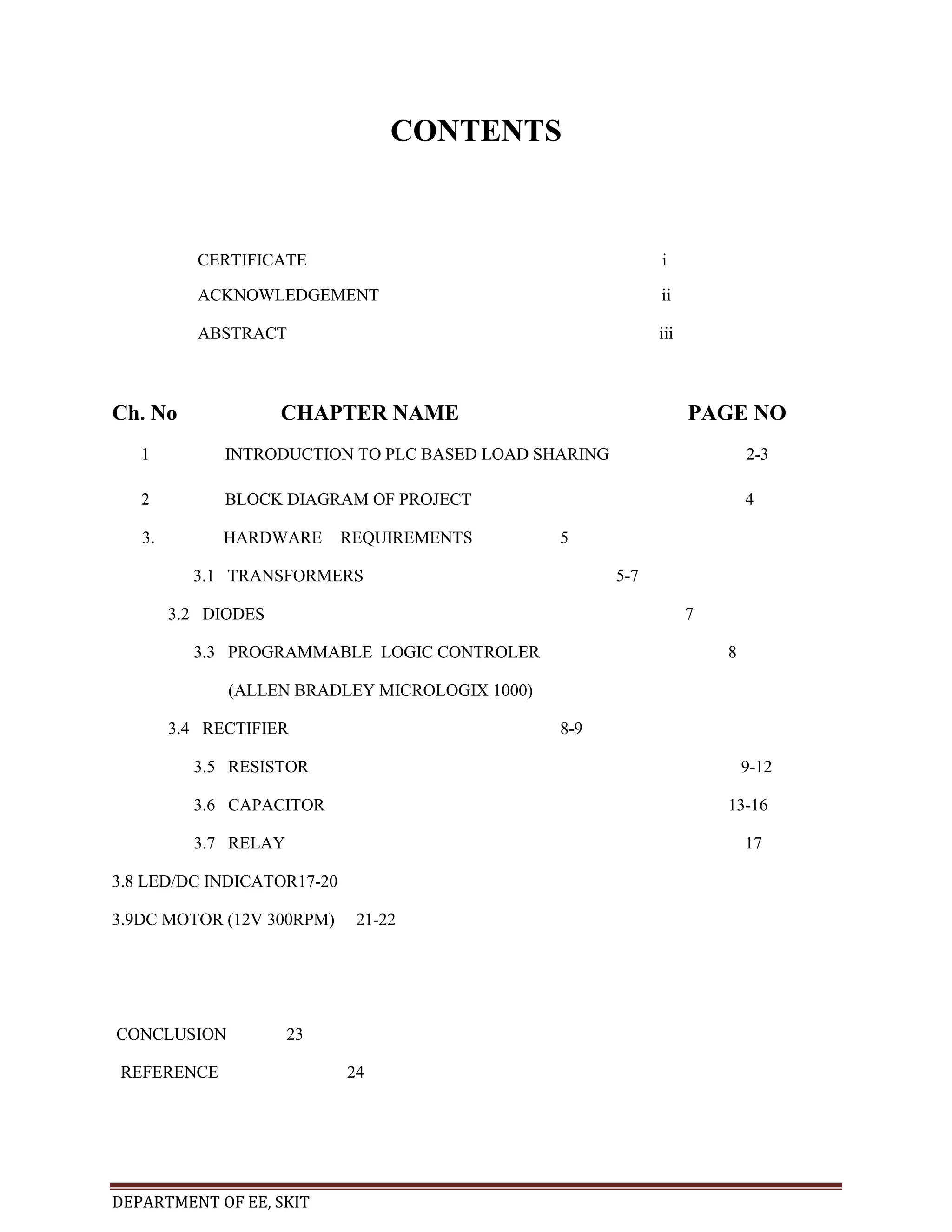 This document provides information about the hardware requirements for a PLC based load sharing project. It discusses transformers, diodes, PLCs, rectifiers, resistors, capacitors, relays, LEDs, and DC motors. Transformers are used to convert AC voltages and connect multiple power sources in parallel. Diodes allow current to flow in one direction. PLCs are used for automation and control. Rectifiers convert AC to DC. Resistors and capacitors are basic electronic components. Relays, LEDs, and DC motors are also used in the circuit. The project aims to automatically share loads between multiple transformers connected to the system based on the load level.