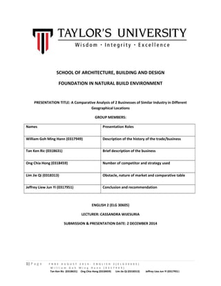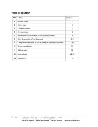 This document is a report comparing two bakery businesses located in different geographical areas. It discusses Wonderbread Bakery and Café in Seremban and The Carpenter's Daughter in Subang. The report includes a table of contents, key summary, history of the bakery trade, brief descriptions of the two businesses, and a comparative analysis of their competitive traits such as number of competitors and strategies used. It finds that The Carpenter's Daughter has been more commercially successful.