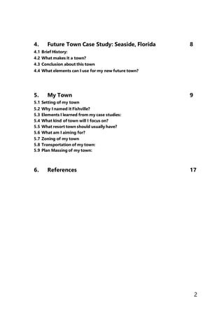 This document provides a report on a student's research project about designing a new town called Fishville. It summarizes the key elements that make up successful towns by examining case studies of ancient, present, and future towns. These include Carthage, Tunisia, Stratford-Upon-Avon, England, and Seaside, Florida. The student then applies lessons learned from the case studies to zone and plan their new town of Fishville, which is aimed to be a sustainable resort town located near the sea. Elements included in the zoning plan are residential housing, pocket parks, a town center, commercial buildings, and a marina.