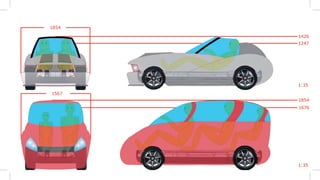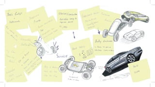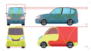This document provides a summary of a student project on designing an electric vehicle. The project aims to introduce electric cars in the short term through a product service system that provides customers with different body styles on a subscription basis. This would help sustain the automotive industry during the transition to electric vehicles. The student conducted research on past electric vehicle studies, spoke with experts, and did brainstorming. A survey was also administered to understand target customers' needs. The resulting concept includes interchangeable interior modules that can be easily configured to different layouts through a rail system in the vehicle base. The goal is to provide customers with different "bodies" through the subscription service.
