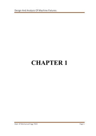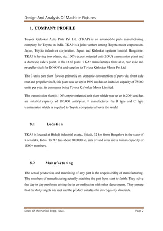 This document provides information about Toyota Kirloskar Auto Parts Pvt Ltd (TKAP), an automobile parts manufacturing company in India. It discusses TKAP's joint venture partners, production facilities, manufacturing processes, organizational structure, and products. Specifically, it outlines the roles and responsibilities of TKAP's manufacturing, maintenance, production engineering, quality control, production control, and safety departments. It also reviews the literature on fixture design, analysis, and synthesis for manufacturing applications.