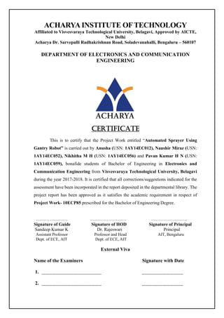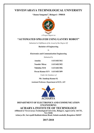 The document is a project report on an 'Automated Sprayer Using Gantry Robot' submitted by engineering students from Acharya Institute of Technology as part of their bachelor's degree requirements. It describes the design and implementation of a robot that automates watering by monitoring soil moisture, employing technologies similar to 3D printing, and includes details on hardware, software, and future applications. The project aims to enhance precision farming and improve water and resource efficiency in agriculture.