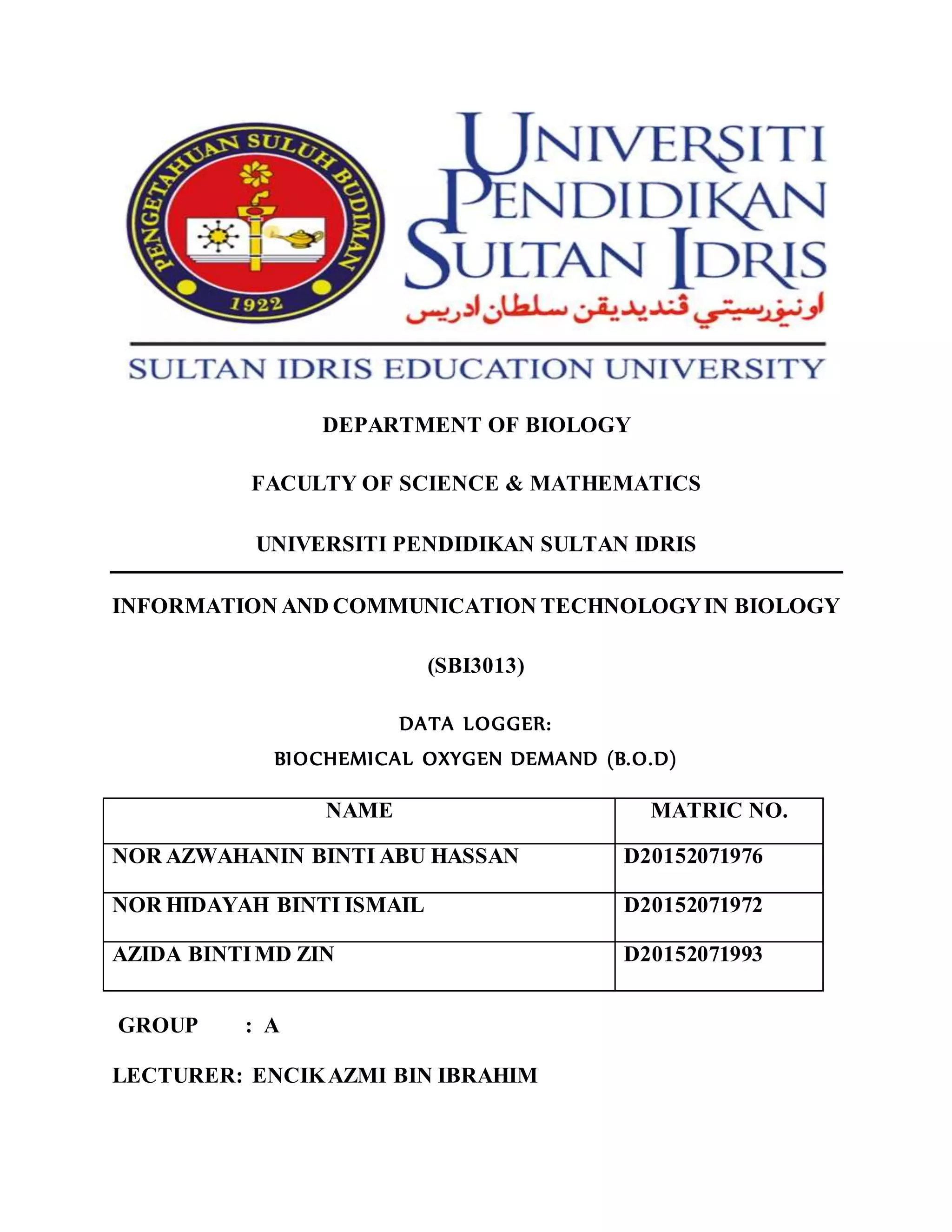 1. The document describes an experiment to determine the biochemical oxygen demand (BOD) of various water samples using data loggers.