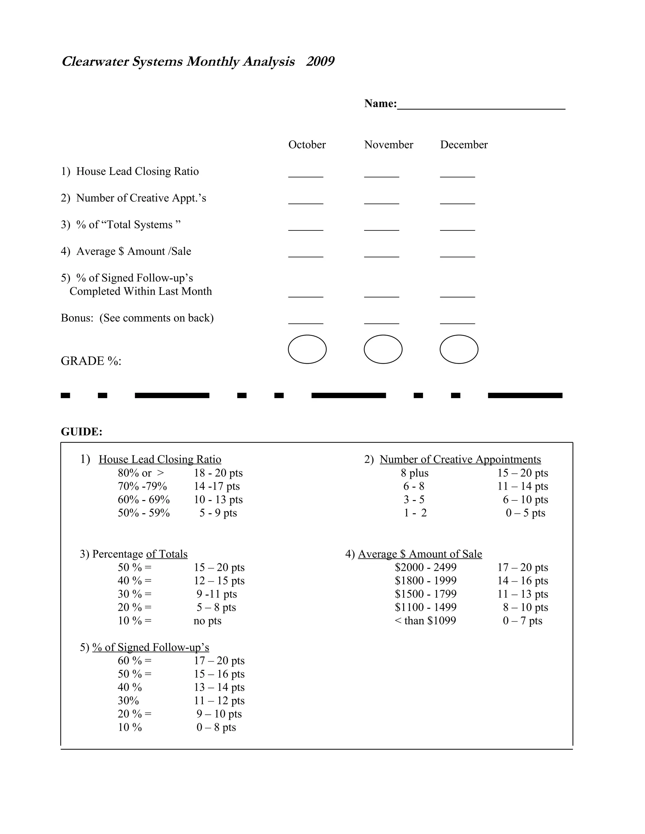 This document provides a monthly analysis for Clearwater Systems in 2009 that includes key performance metrics for October, November and December. It tracks the house lead closing ratio, number of creative appointments, percentage of total systems sold, average sale amount, and percentage of signed follow-ups completed. Representatives are graded on these metrics and can earn up to 20 bonus points based on comments provided.
