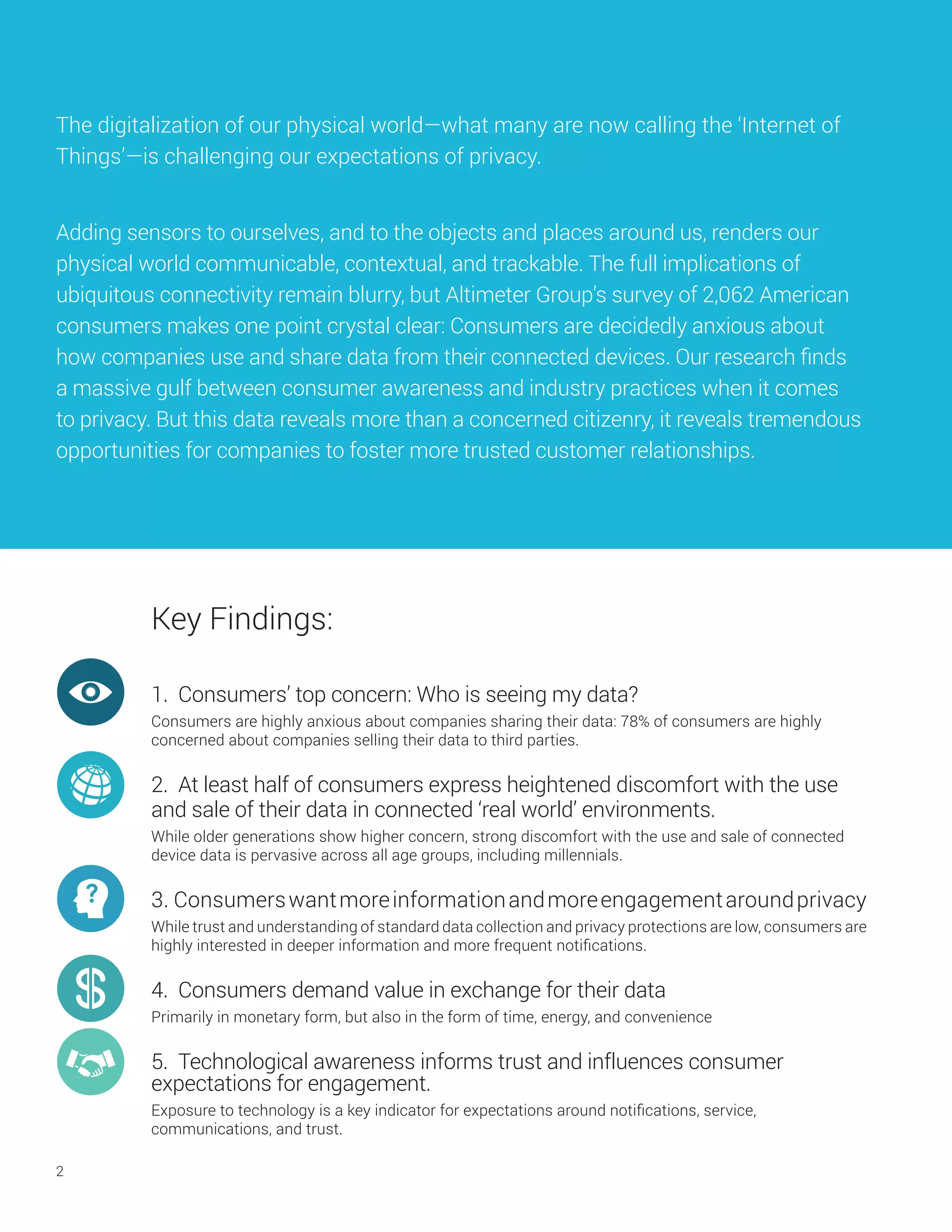1) The document is a research report that summarizes a survey of over 2,000 American consumers on their perceptions of privacy regarding connected devices and the Internet of Things.