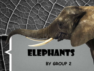 Elephants are the largest land animals. They can live up to 70 years. There are two main species - African and Asian elephants. African elephants are larger than Asian elephants. Both males and females have trunks which are versatile and used for tasks like breathing, smelling, grasping. Mating involves the male mounting the female from behind for a few minutes. Gestation lasts 22 months and births are assisted by other females in the herd. Babies are raised communally without the father. Elephants are herbivores that consume large amounts of plants and water each day. They communicate over long distances and prefer staying near water sources.
