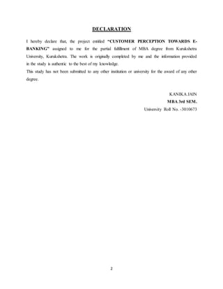 This document provides an introduction to a student's summer training report on customer perception of e-banking at HDFC Bank. It includes a declaration by the student that the work is original, a certificate from the faculty advisor, and an acknowledgement of those who helped. The introduction defines key terms like customer perception, e-banking, and provides background on the growth of e-banking in India and how it has evolved from basic information online to more advanced transactional capabilities.