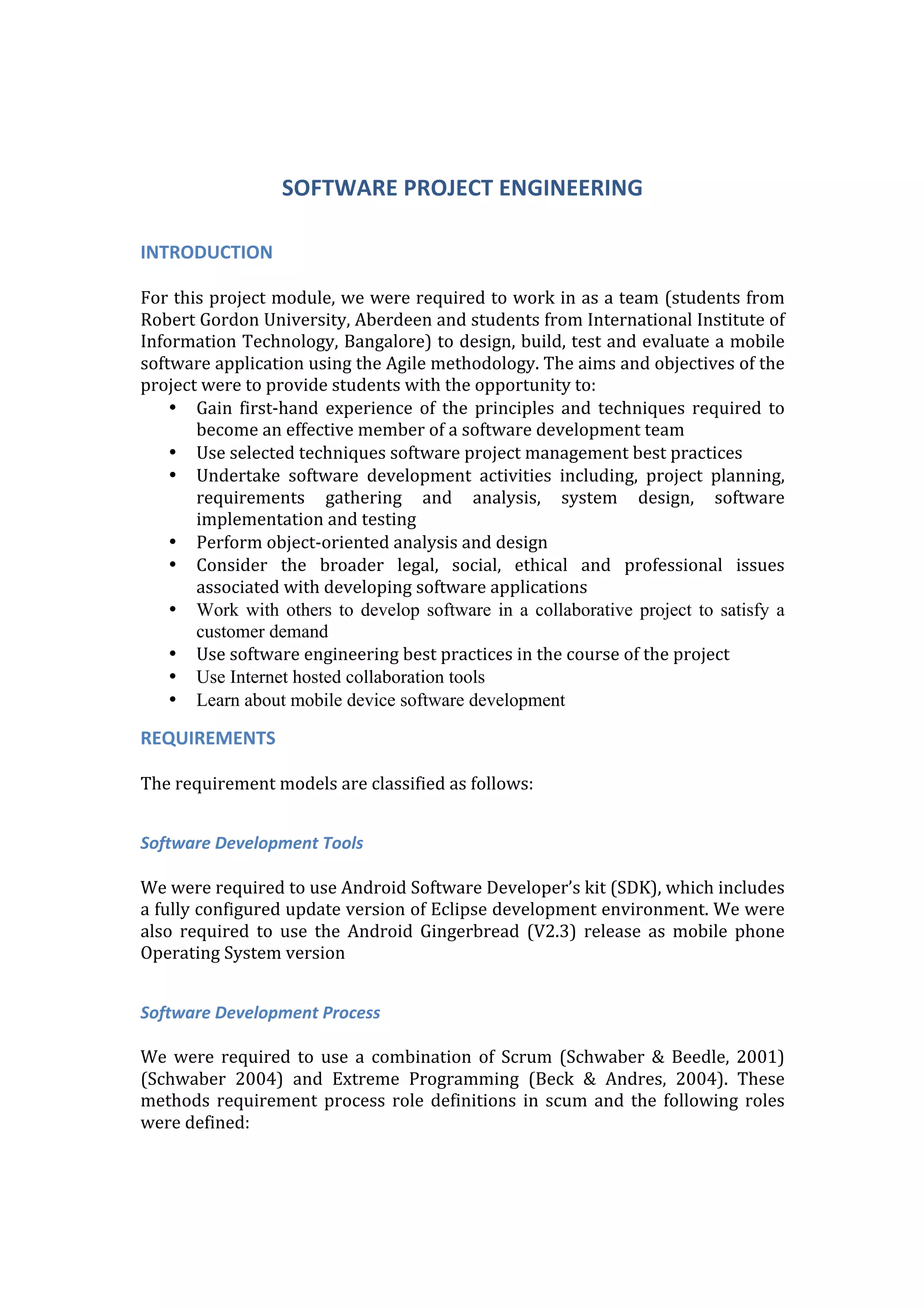 This document outlines the requirements for a mobile software application project using an agile development methodology. It includes sections on software development tools, process, and application requirements. The requirements involve using Android SDK and Gingerbread OS, following Scrum and XP processes, and defining user stories and surveys. Key requirements include allowing survey participants to complete mobile surveys, administrators to create surveys, and survey owners to view response data reports.