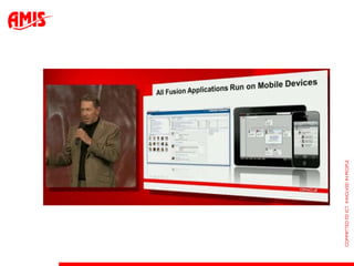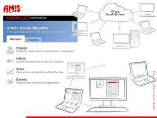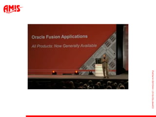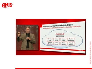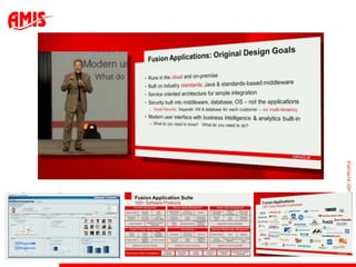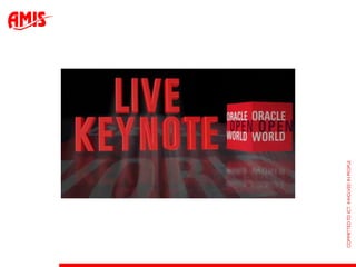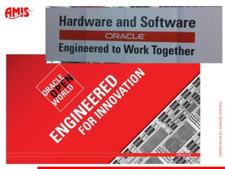 The document summarizes the Oracle Open World and JavaOne 2011 conferences, highlighting major announcements and the layout of the event in San Francisco. Key topics included innovations in Oracle's products such as Exalogic, WebLogic, and Oracle's Cloud strategies, as well as discussions on big data, NoSQL, and enterprise architecture. The report also features training opportunities available through AMIS services and insights into future trends in technology, emphasizing the importance of innovation in driving business transformation.