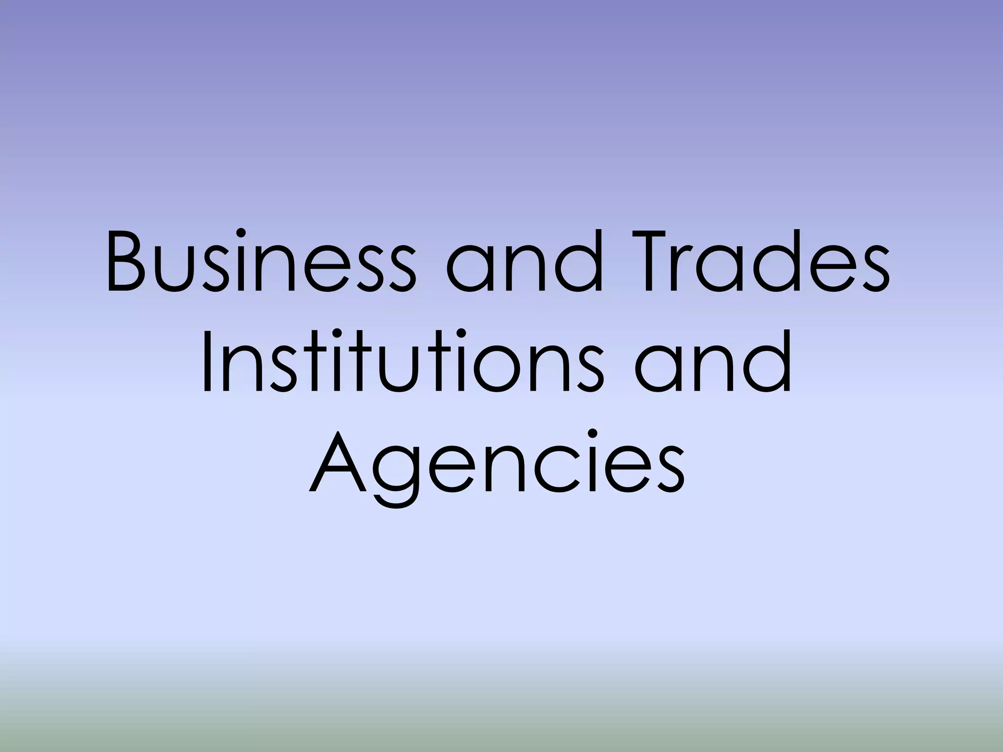 This document discusses government institutions and agencies that support business and trade in the Philippines. It outlines the roles of the Securities and Exchange Commission (SEC) and Department of Trade and Industry (DTI) in regulating markets and coordinating trade. The document also explains privatization, where the government transfers control of businesses to private organizations, and nationalization, where the government takes over businesses. It notes debates around more efficient private management versus ensuring public access to essential services.