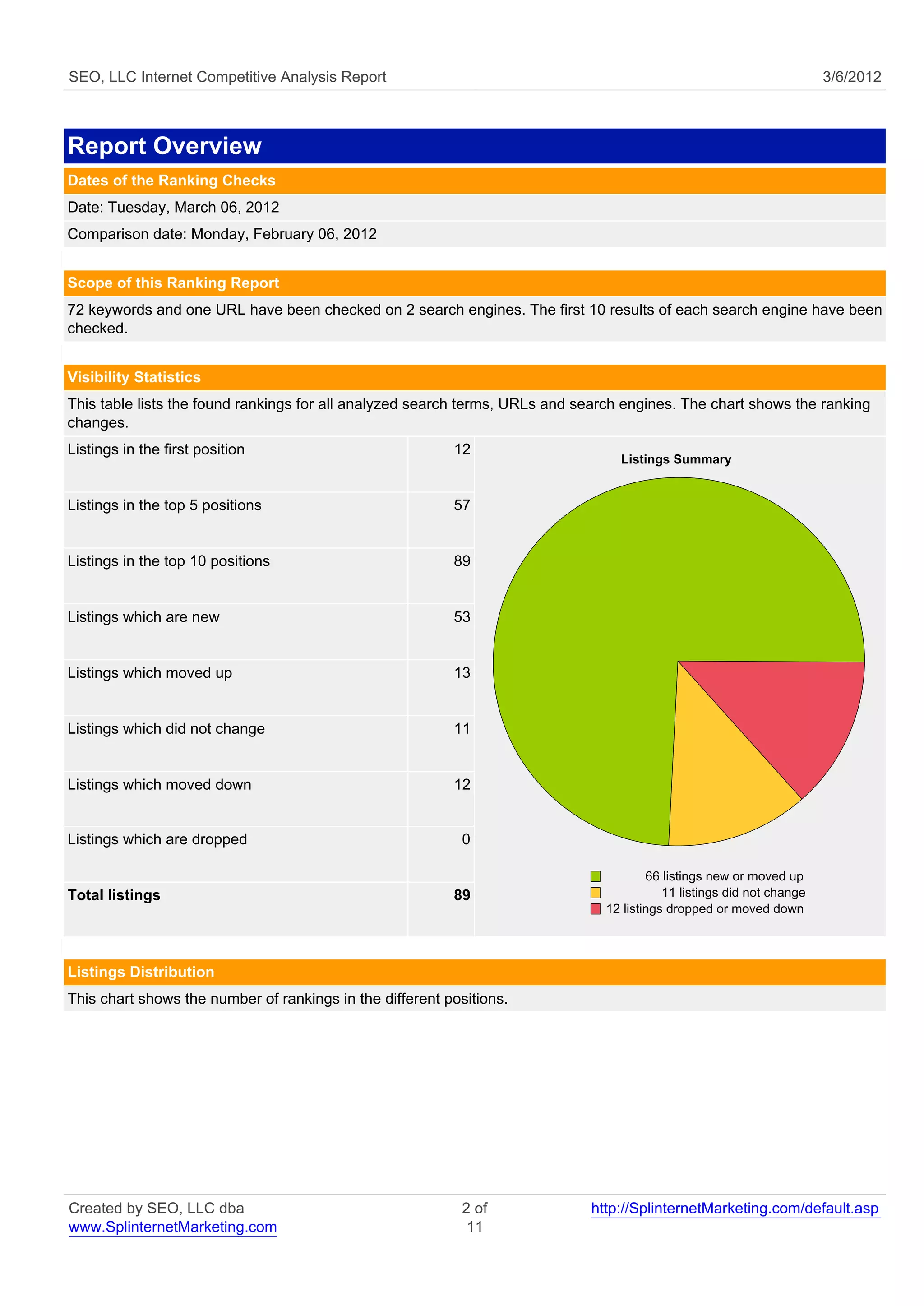 This report provides an analysis of SEO, LLC's internet competitive analysis from March 6, 2012. It analyzed 72 keywords and one URL across Google and Bing. The analysis found 89 listings in the top 10 positions across the search engines. 66 listings were new or moved up, while 11 did not change position and 12 dropped or moved down. The majority of top 10 listings were found on Google.com (67) compared to Bing.com (22).