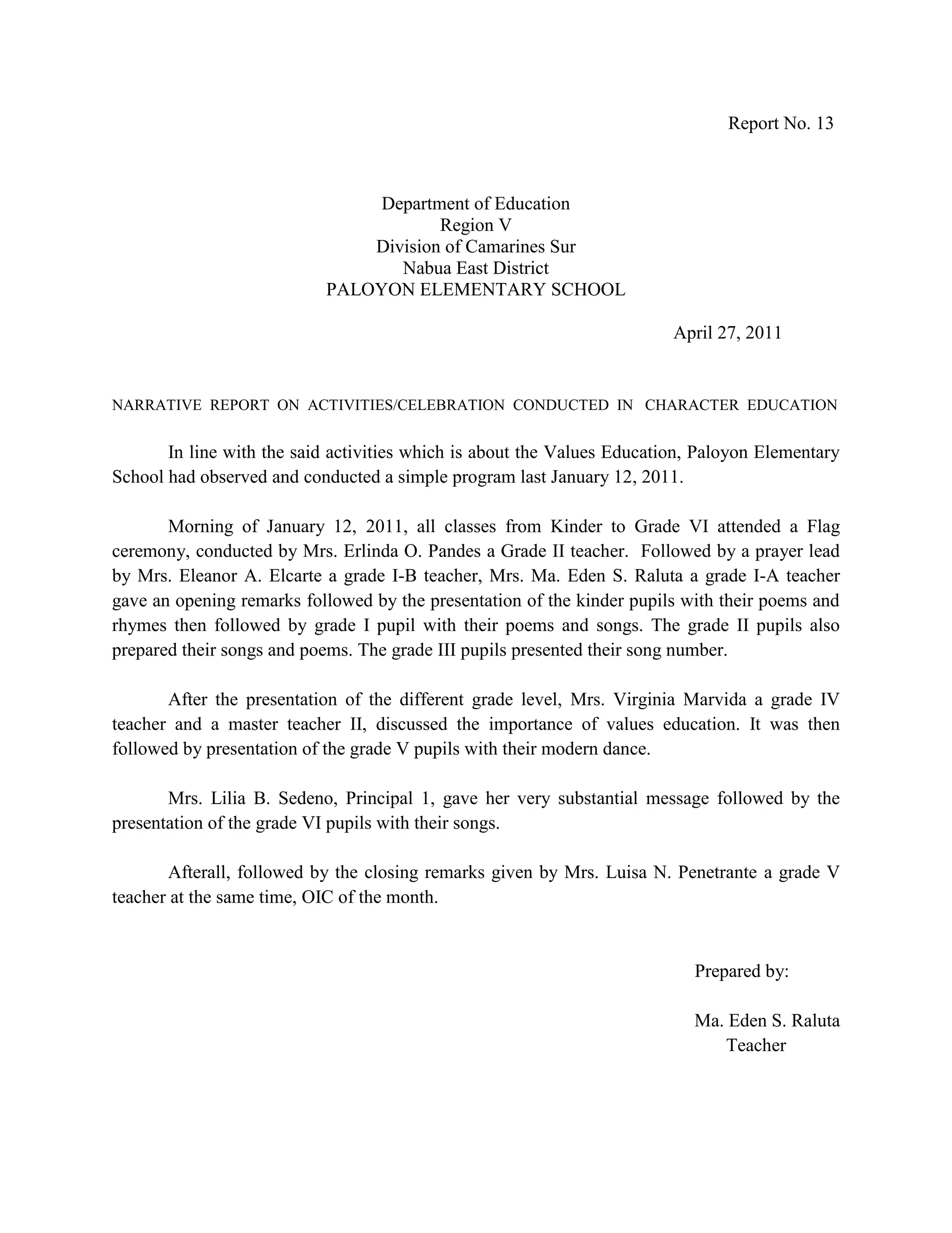 The document provides a narrative report on activities conducted at Paloyon Elementary School in the Philippines to promote character education and values. It summarizes that on January 12, 2011 the school held a flag ceremony and presentations by students of different grade levels through poems, songs, and a dance. A teacher then discussed the importance of values education. The principal gave a message before closing remarks. The report was prepared by teacher Ma. Eden S. Raluta.