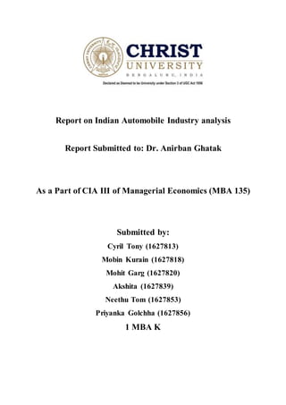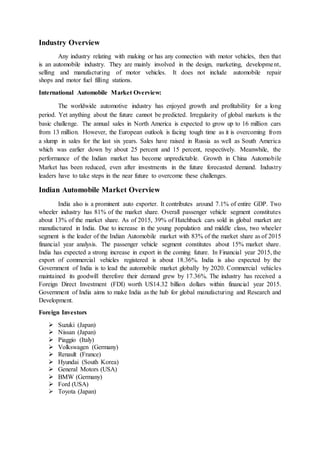 The report provides an overview of the Indian automobile industry, including key players. It discusses the industry's structure and market share breakdown. Some of the major challenges facing the industry are meeting social and environmental expectations, managing quality, and maintaining brand value. The future of the industry is expected to involve increased production capacity, more investment from global companies, and India becoming a research and development hub for automotive technology.