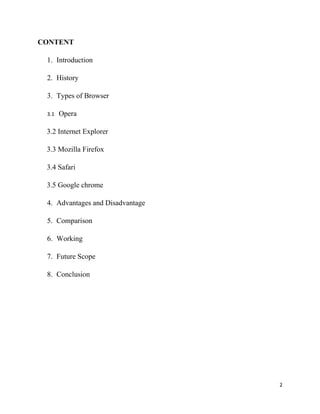 Internet Explorer, Firefox, Chrome, Safari and Opera are some of the most popular web browsers currently available. They each have different histories, features and market shares. This document provides an overview of the key details and differences between these major browsers.