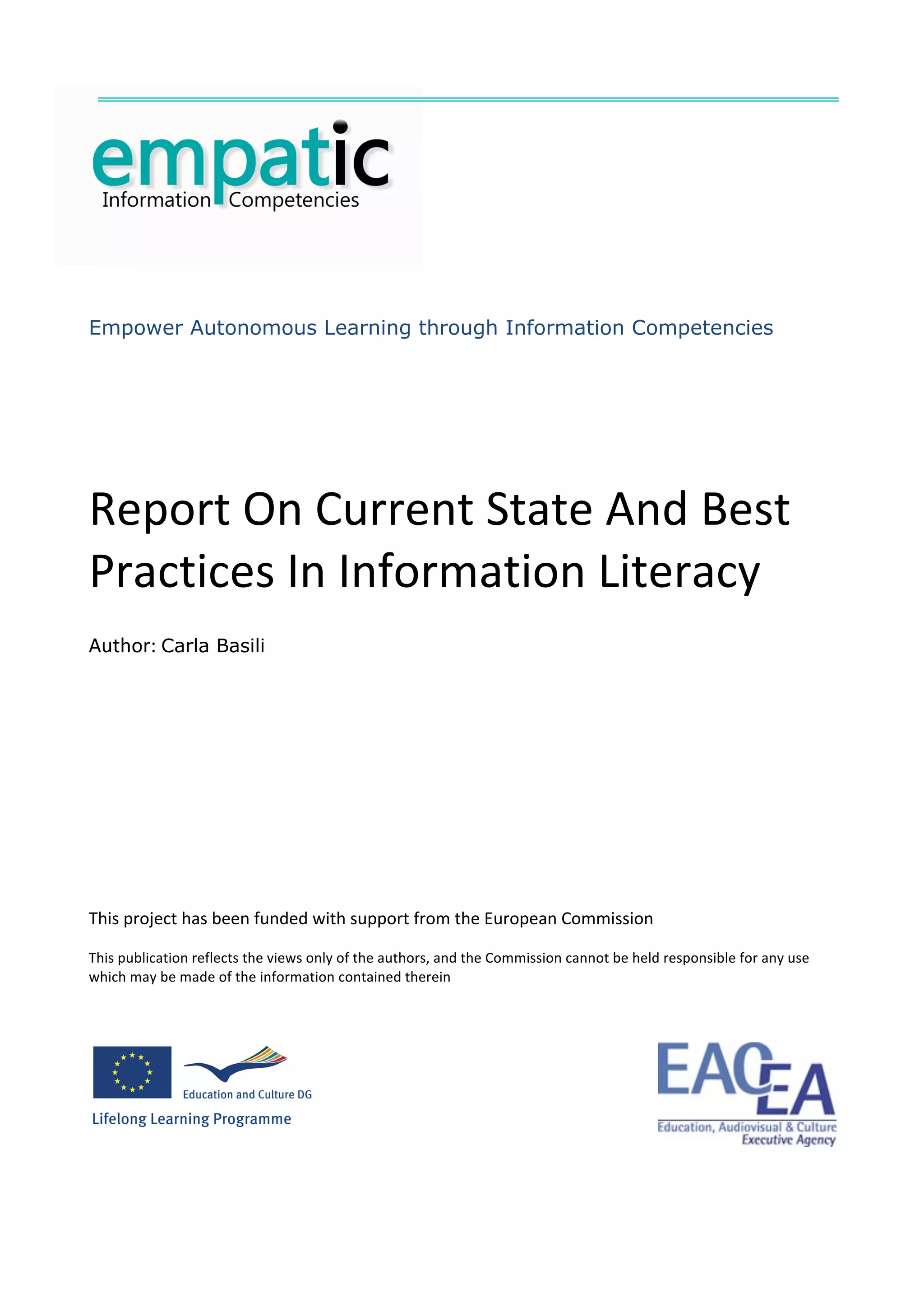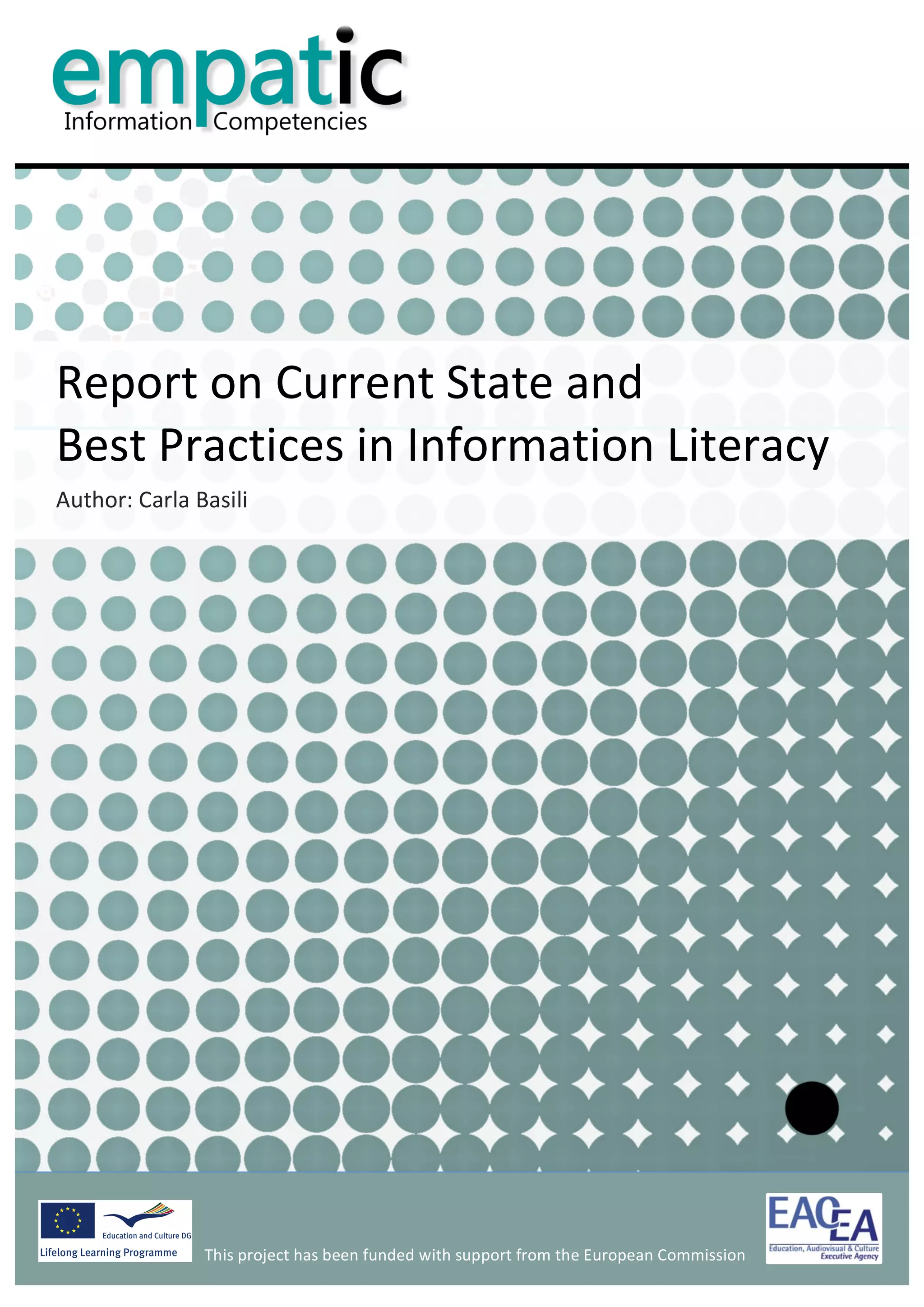 This section provides an overview of the state of the art in information literacy. It discusses the strong connection between information literacy and lifelong learning established in influential definitions and frameworks. Information literacy is seen as a key component of independent learning and lifelong learning. The section also examines definitions of information literacy put forward by international organizations, researchers, and library bodies. It analyzes frameworks for information literacy developed by bodies like ACRL, ANZIIL and SCONUL. Finally, it explores the role of information literacy in different educational contexts like higher education, schools, vocational training and lifelong learning.