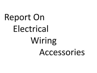 This document provides definitions and information about electrical wiring accessories. It discusses different types of wiring systems used in residential and commercial buildings like cleat wiring, casing and capping wiring, conducting wiring, and C.T.S. or T.R.S. wiring. It also covers wiring accessories required for domestic wiring, curriculum for house wiring, types of conducting wiring, and advantages and disadvantages of different wiring methods. The document concludes with a summary of the electrical accessories market trends.