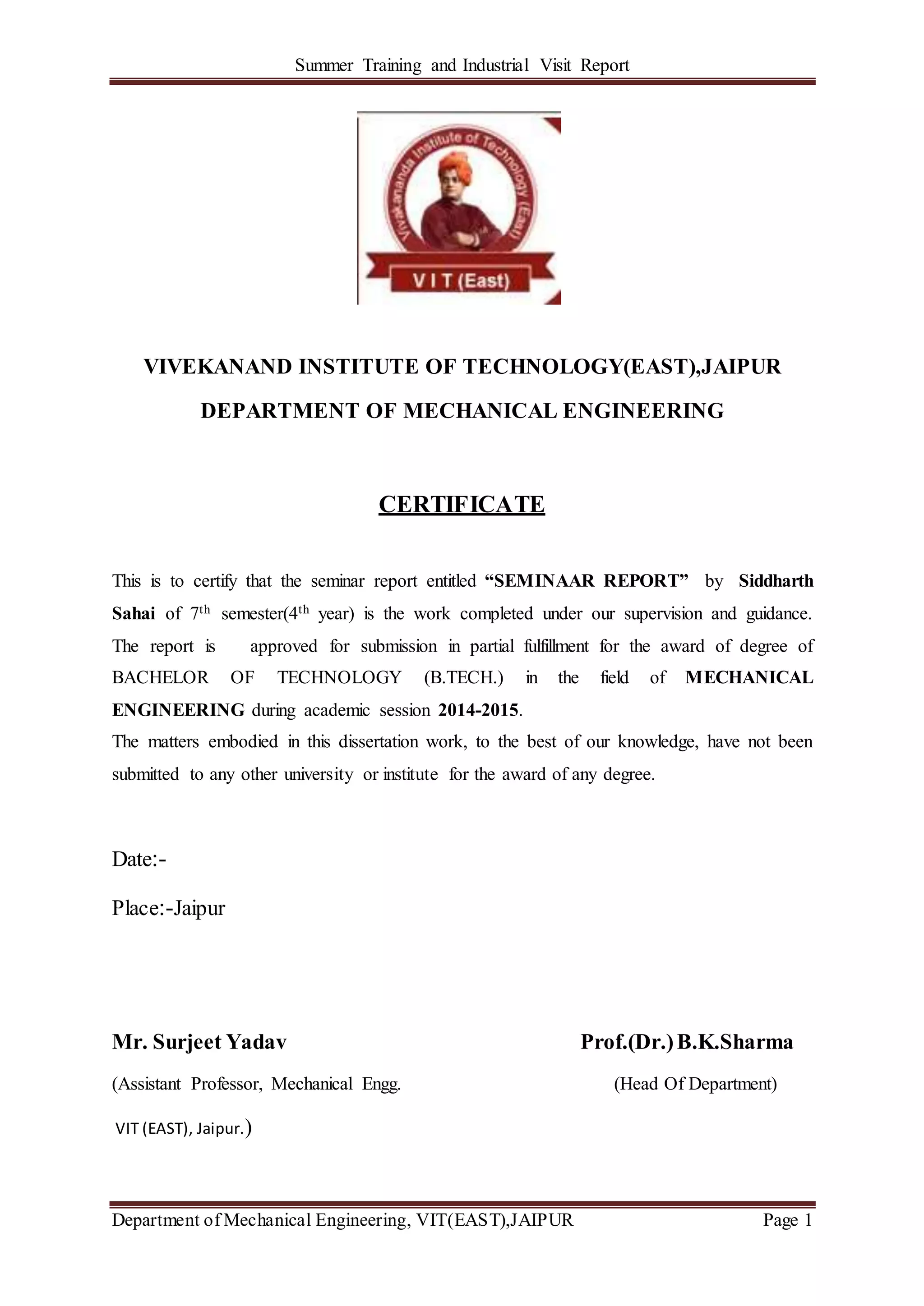 The document is a seminar report submitted by a student for their B.Tech in Mechanical Engineering. It provides details about the student's 6-week summer training at HMT Limited in Ajmer, including an overview of the company and descriptions of various departments.