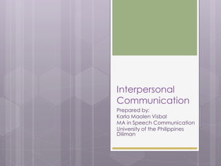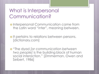 This document provides an overview of interpersonal communication. It defines interpersonal communication as a selective and ongoing process between two people who build understanding of each other. The document then discusses reasons for communication such as fulfilling needs per Maslow's hierarchy. It also covers models of communication, principles of interpersonal communication, theories such as social exchange theory, and stages of relationships.