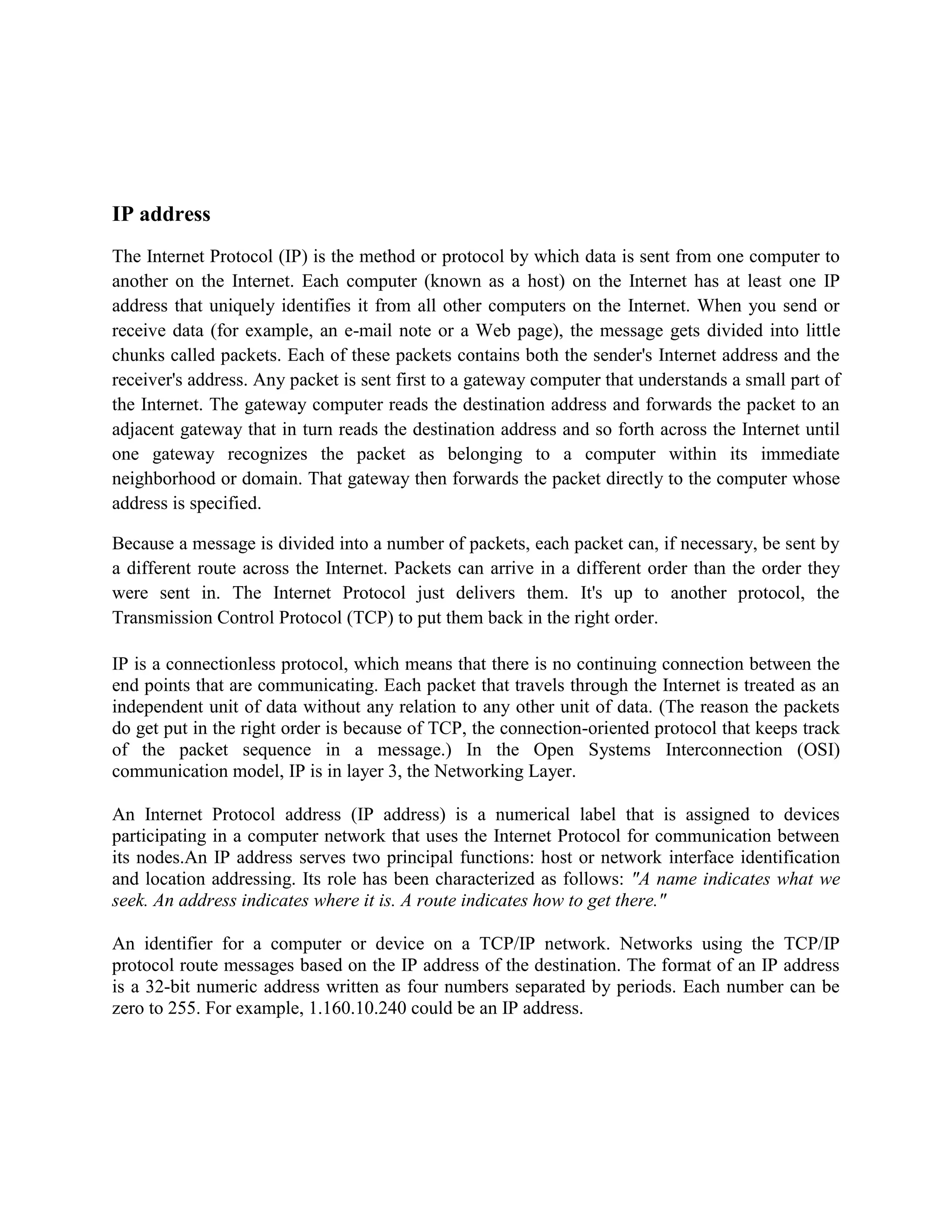 IP is the protocol that handles addressing and routing of data across the internet. Each device connected to the internet has a unique IP address that is used to identify it and route data to it. There are different classes of IP addresses that determine the number of devices that can be connected to a network. IP addresses are represented numerically in dot-decimal notation and newer versions of IP have expanded the available address space to meet growing internet demands.