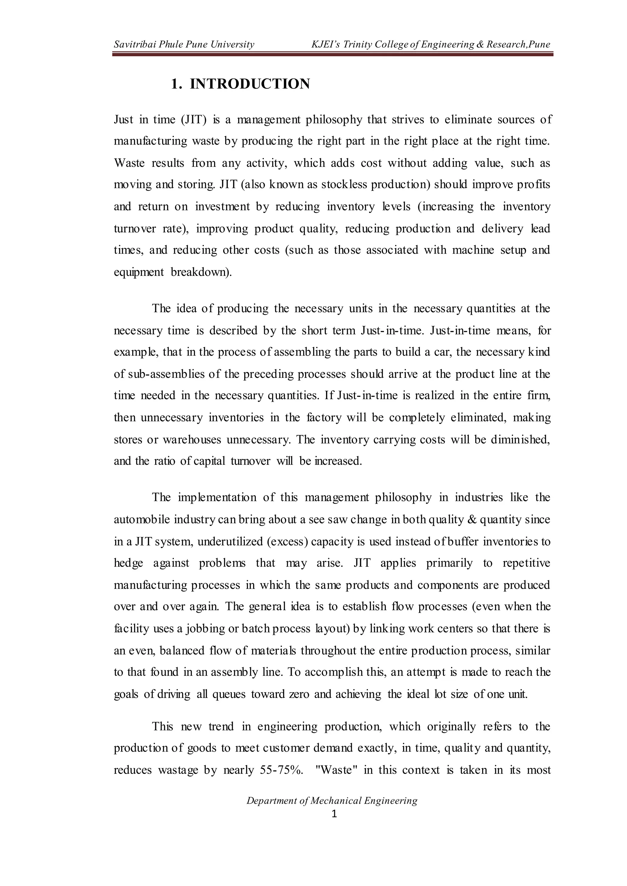 The document discusses the Just-In-Time (JIT) management philosophy, which aims to minimize manufacturing waste by ensuring that the right part is produced in the right place at the right time, thereby improving efficiency and quality while reducing costs. Originating from Japan and exemplified by Toyota, JIT emphasizes team involvement, quality control at the source, and systematic elimination of waste including overproduction and waiting times. A case study highlights the application of JIT principles in a Malaysian assembly line, detailing the benefits of an improved layout and the implementation of gravity flow rack systems to enhance production efficiency.