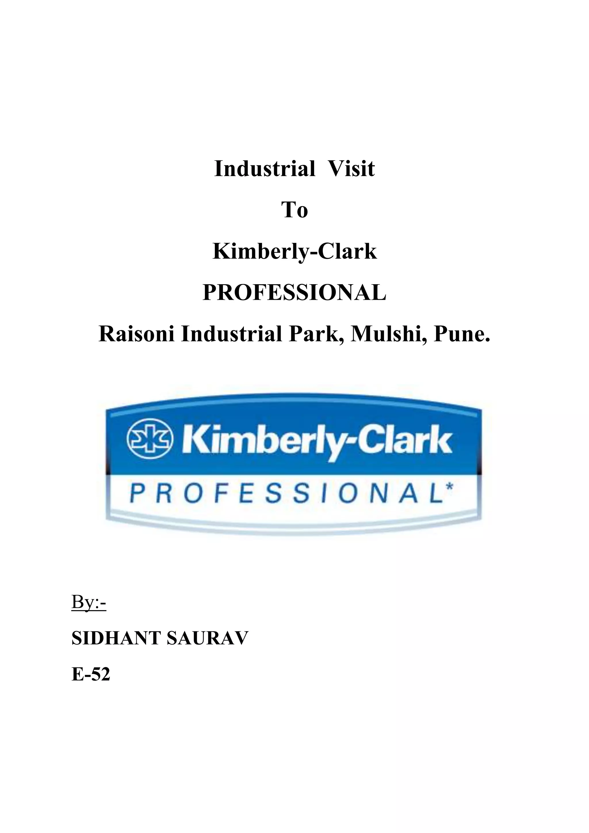The document summarizes an industrial visit to the Kimberly-Clark Professional plant in Raisoni Industrial Park, Pune. The plant is operated by Kohinoor Tissue Converting Company on behalf of Kimberly-Clark. The manufacturing process involves procuring finished raw materials, cutting them to size, packaging, and storage before dispatch. The plant packages hand towels, facial tissues, bathroom tissue, and sterilization wraps under the Kimsoft, Scott, and KimGuard brands. Kimberly-Clark is committed to corporate social responsibility through charitable donations, employee volunteering, and promoting diversity.