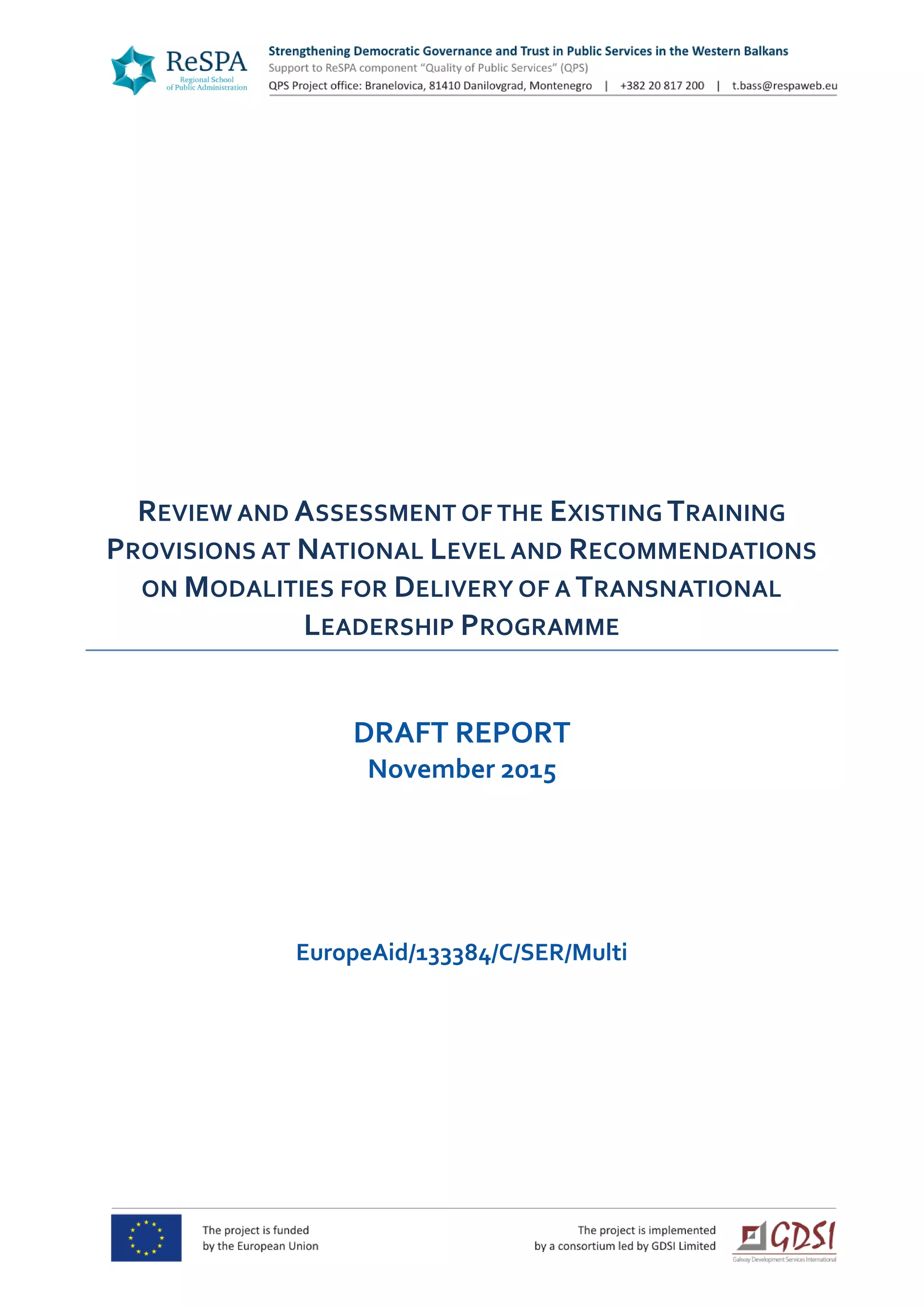 This document provides a review and assessment of leadership and management training programs in the ReSPA member countries (Albania, Bosnia and Herzegovina, Kosovo, Macedonia, Montenegro, and Serbia). It finds that while some management training is provided, there is little focus on leadership development. It recommends a new transnational leadership program be designed and delivered by ReSPA to address this gap. Key steps in the program's design include defining leadership competencies, establishing selection criteria, assessing skills, and providing developmental activities and evaluation.