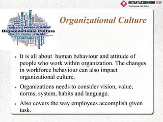 The document discusses the relationship between organizational culture and structure, highlighting their impact on employee behavior and communication within organizations. City College adopts a flat structure emphasizing employee empowerment, while Enterprise uses a tall hierarchy with multiple management levels. Both organizations demonstrate that understanding culture and structure is essential for achieving goals and enhancing productivity.